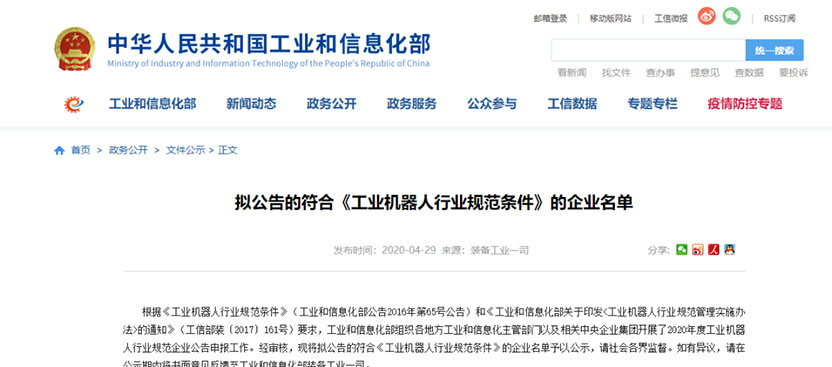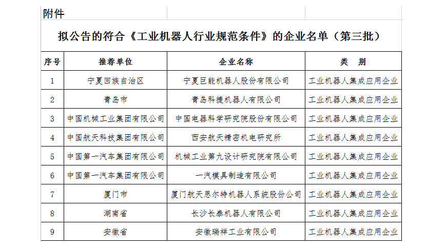 近日,工業(yè)和信息化部公示擬公告的符合《工業(yè)機器人行業(yè)規(guī)范條件》的企業(yè)名單,巨能機器人成功入選。