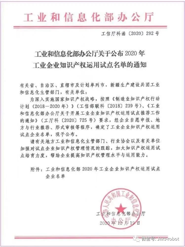 近日,工業(yè)和信息化部公布了2020年度工業(yè)企業(yè)知識產權運用試點名單,寧夏巨能機器人股份有限公司入選。