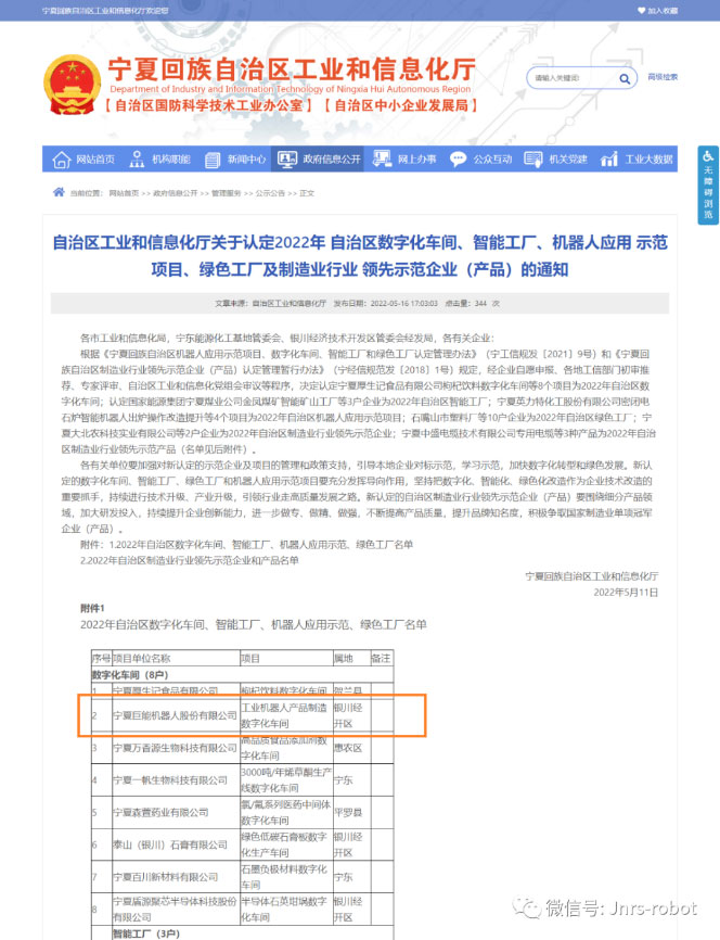 近日,寧夏自治區(qū)工業(yè)和信息化廳公布了2022年自治區(qū)數(shù)字化車間名單,巨能機器人成功獲評數(shù)字化車間。