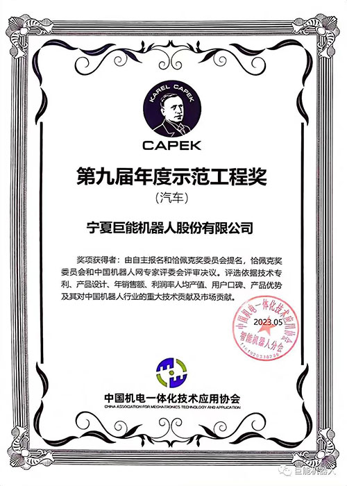 “恰佩克”,素有“機器人行業(yè)諾貝爾”之稱,該獎項的設立,旨在對機器人行業(yè)中具有戰(zhàn)略遠見的領導型企業(yè)做標桿定位。在5月18日落幕的第十三屆中國國際機器人高峰論壇暨第九屆恰佩克頒獎儀式現(xiàn)場,巨能機器人憑借在工業(yè)機器人智能制造系統(tǒng)解決方案的綜合實力和市場口碑,榮膺“第九屆恰佩克獎年度示范工程獎”。