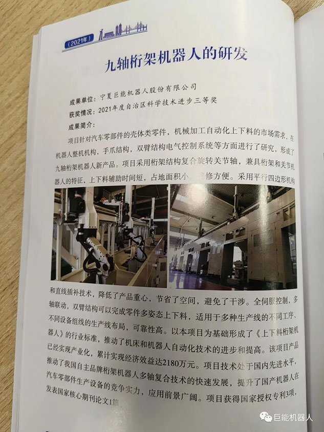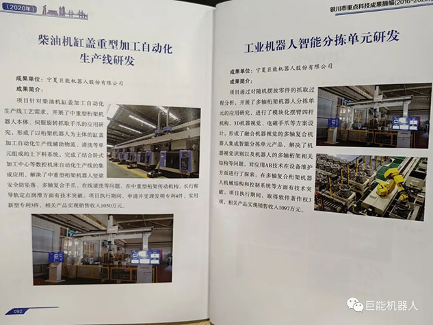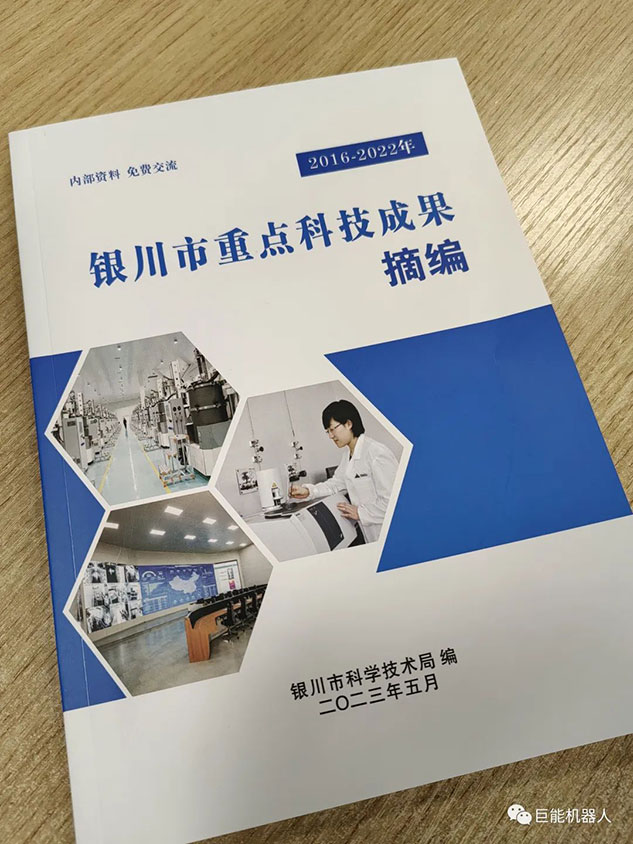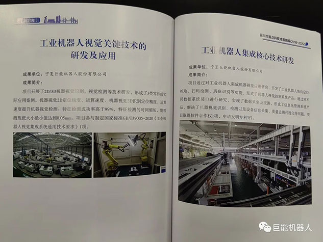 在《銀川市重點(diǎn)科技成果摘編(2016-2022年)》中,巨能機(jī)器人公司的《工業(yè)機(jī)器人自動(dòng)化生產(chǎn)線(xiàn)研發(fā)項(xiàng)目》、《大型復(fù)雜曲面葉片機(jī)器人智能打磨技術(shù)與裝備》、《工業(yè)機(jī)器人視覺(jué)關(guān)鍵技術(shù)的研發(fā)與應(yīng)用》、《工業(yè)機(jī)器人集成核心技術(shù)研發(fā)》、《柴油機(jī)缸蓋重型加工自動(dòng)化產(chǎn)線(xiàn)研發(fā)》、《工業(yè)機(jī)器人智能分揀單元研發(fā)》等多項(xiàng)科技成果被收錄其中。