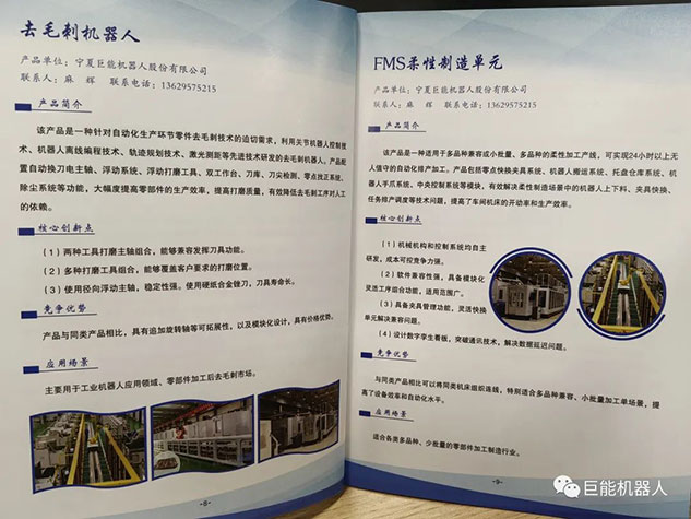 在《銀川市科技創(chuàng)新產(chǎn)品(2023)手冊(cè)》中,巨能機(jī)器人公司《去毛刺機(jī)器人》和《FMS柔性制造單元》兩項(xiàng)產(chǎn)品收錄其中。