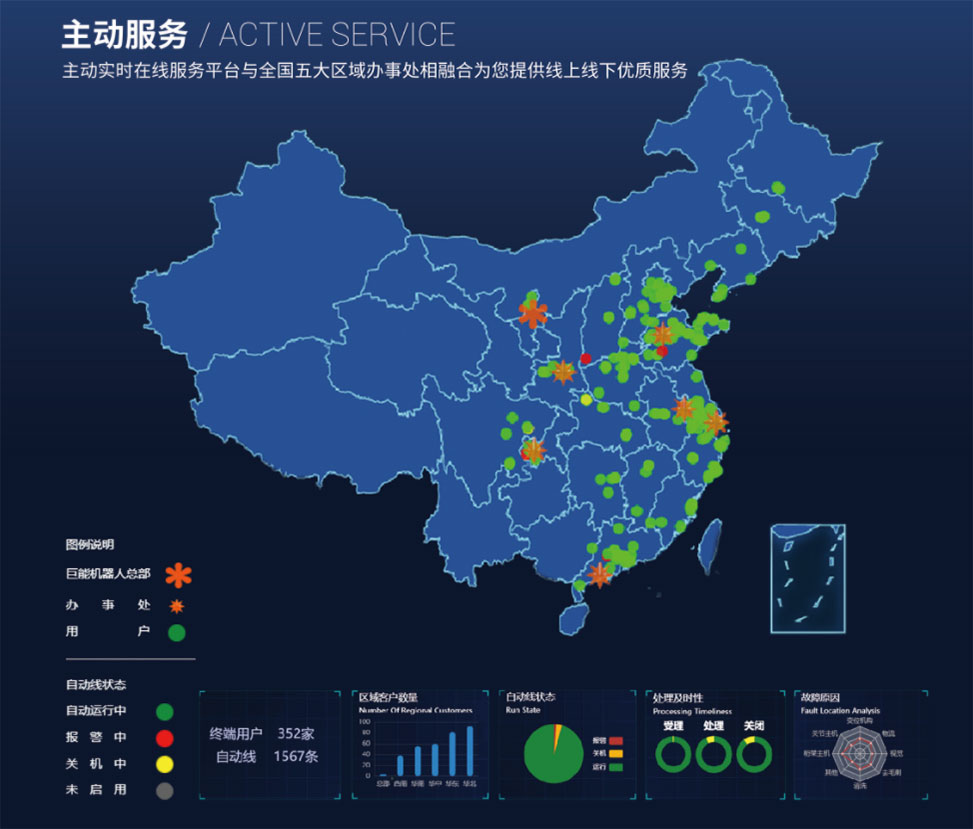 目前,巨能機(jī)器人已在華東、華南、華中、華北、西南等六個(gè)區(qū)域設(shè)立駐地服務(wù)機(jī)構(gòu),售后服務(wù)工程師可第一時(shí)間為用戶提供就近在地服務(wù)。同時(shí),巨能機(jī)器人搭建的遠(yuǎn)程主動(dòng)服務(wù)平臺(tái),通過物聯(lián)網(wǎng)和大數(shù)據(jù),可實(shí)時(shí)在線感知用戶產(chǎn)線運(yùn)行狀況,為用戶提供實(shí)時(shí)在線技術(shù)支持。