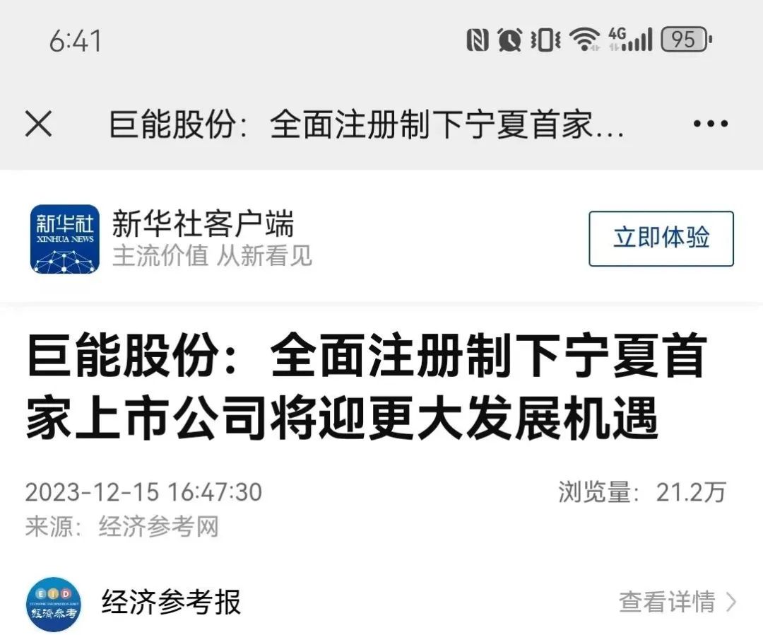 【題記】2023年12月15日,新華社客戶端刊發(fā)《巨能股份:全面注冊(cè)制下寧夏首家上市公司將迎來(lái)更大發(fā)展機(jī)遇》(詳情見原文鏈接),以下為報(bào)道全文。